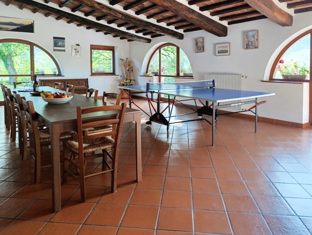 La sala da pranzo offre un ambiente rustico e luminoso dove ritrovarsi per una colazione lenta, un pranzo conviviale o una cena tra amici, immersi nella tranquillità della campagna toscana.